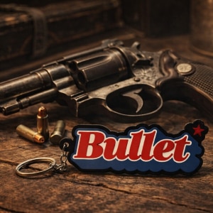 アートディレクター石崎圭一氏が手がけたBulletの公式ロゴデザインをラバーキーホルダーにしました。アメリカ合衆国の国旗である星条旗カラー(青・赤・白)をイメージしたオールドアメリカンな洗練されたスタイリッシュなデザインとなっています。